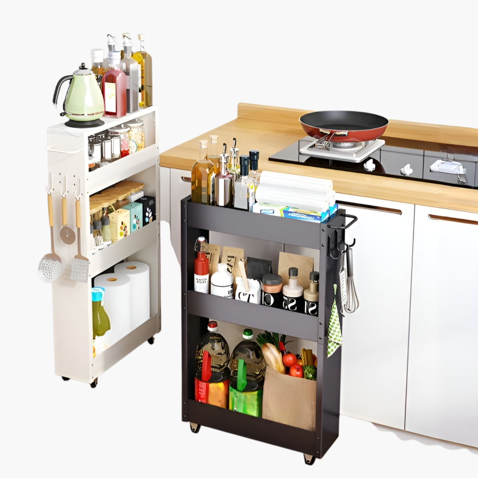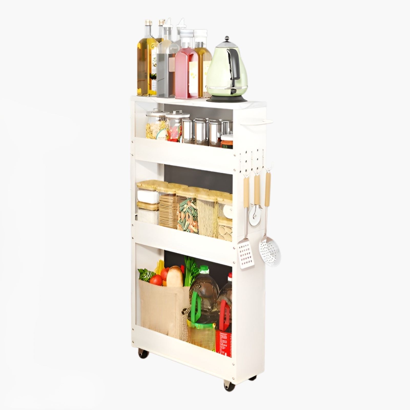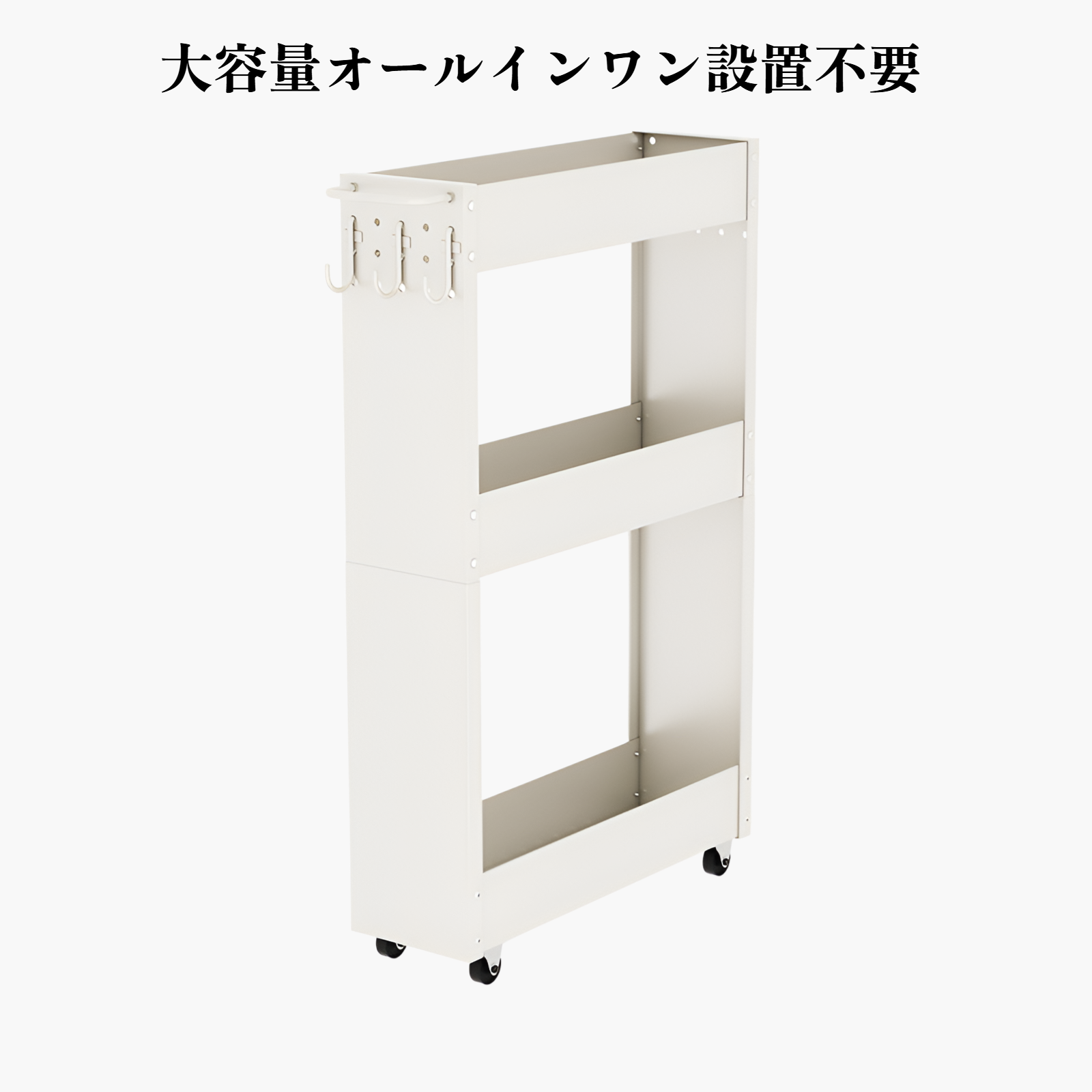 キャスター付き多層ラックは、キッチンやバスルームの収納力を向上。フック付きパンチングボードで小物も整理可能。省スペース設計。